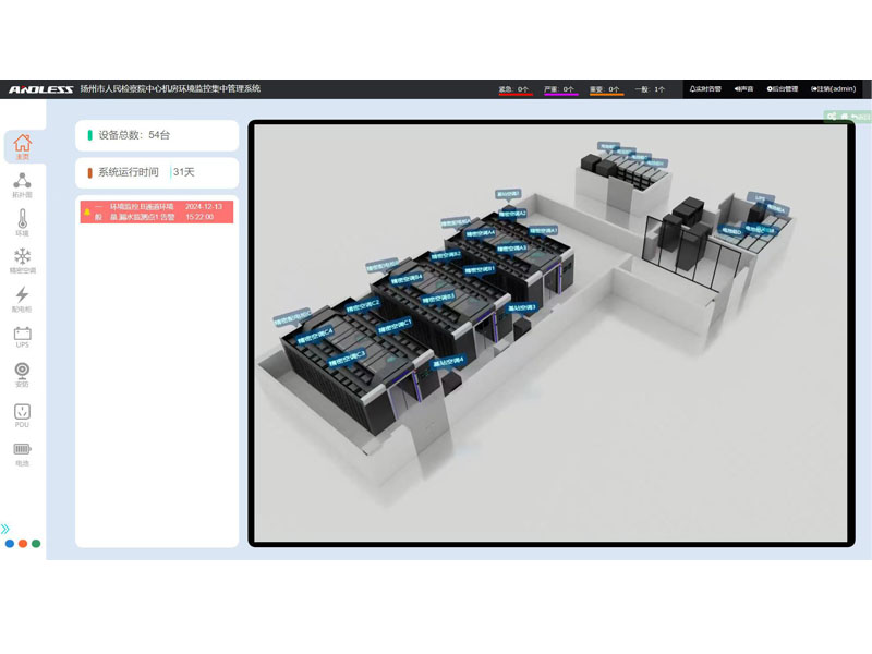 近期有幸為江蘇省某市檢察院提供三套安德力士品牌微模塊機(jī)房設(shè)備,涉及系統(tǒng)有:UPS不間斷電源、精密空調(diào)、機(jī)柜、配電、動(dòng)力環(huán)境監(jiān)控等系統(tǒng);涉及主要設(shè)備有:UPS主機(jī)(30KVA、40KVA、300KVA)、鉛酸蓄電池(100AH64節(jié)、200AH128節(jié)、250AH320節(jié))、精密空調(diào)(行級25KW12臺(tái)、基站12.5KW4臺(tái))、機(jī)柜51套,現(xiàn)已全部安裝調(diào)試完成。